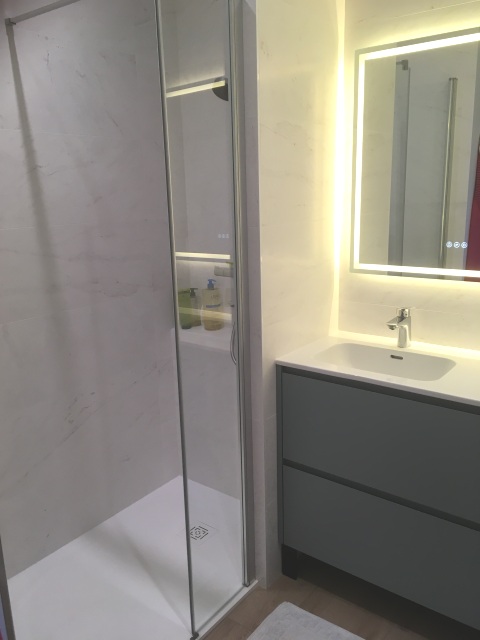 Intégration d’un receveur résine extra-plat au plus bas après ajustement et reprises des doublages et cloisonnement existants, intégration d’une tablette dans la douche, et pose d’un meuble vasque sur mesure réalisé par EBENOURIEZH sans joints résiduels, après coordination plâtrerie et carrelage sur la base d’une conception validée en amont par les clients.